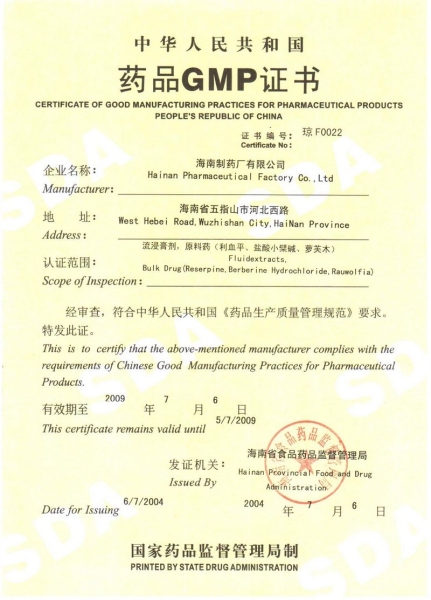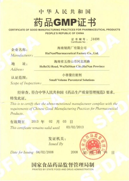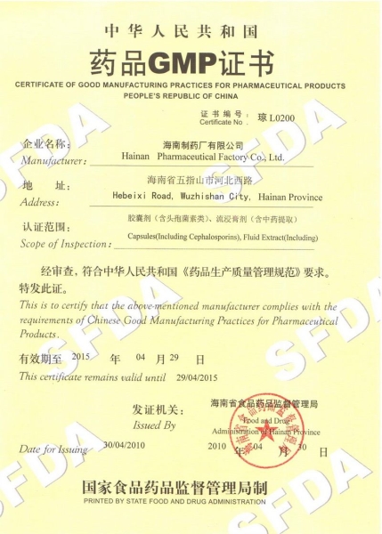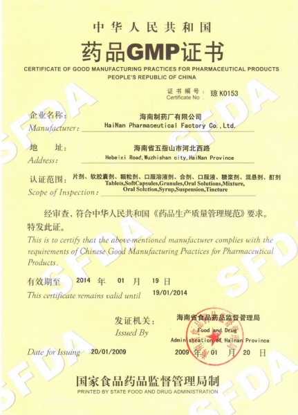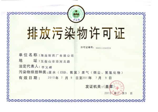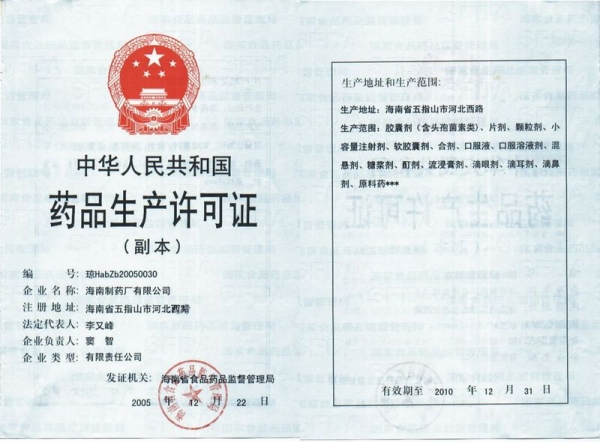 海南制藥廠有限公司藥品生產(chǎn)許證可證