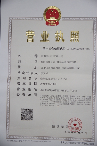 海南制藥廠有限公司營業(yè)執(zhí)照(三證合一)