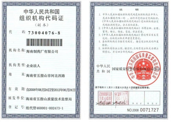 海南制藥廠(chǎng)有限公司生產(chǎn)許可證